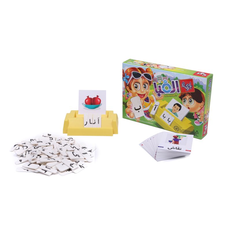 بازی الفبا ابزار بسیار مناسبی برای تمرین و یادگیری شکل نوشتاری کلمات فارسی اول دبستان است. در این بازی ابتدا کارتها را یکی یکی و به ترتیب کلماتی که در کتاب آمده است به کودک نشان داده، سعی میکنیم به خوبی شکل نوشتاری کلمه را یاد بگیرد. سپس هر کارت را روی پایه میگذاریم و روی کلمه را با زائدهی پلاستیکی میپوشانیم. حال کودک باید با استفاده از قطعات فومی کلمه را بسازد. توصیه میشود در هر بار بازی تعدادی از کلمات را آموزش بدهید و سپس در نوبت بازی بعد از او بخواهید کلمات را بدون دیدن شکل کلمه بسازد. تحقیقات نشان داده است که در امر آموزش هر چقدر از ابزار متنوعتری استفاده کنیم، یادگیری عمیقتر و نتیجه ماندگارتر خواهد بود.