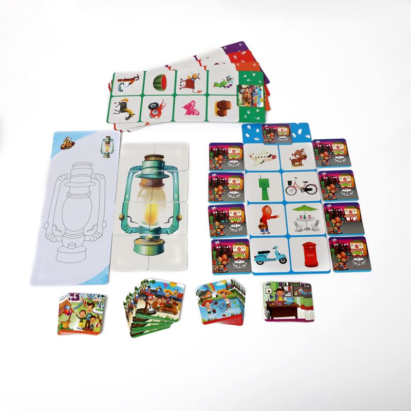 قایم باشک در واقع شبیه‌سازی بازی معروفی است که در آن یک نفر از اتاق بیرون می‌رود و بقیه چیزی را برمی‌دارند یا جابجا می‌کنند تا موقع برگشتن متوجه شود چه چیزی عوض شده است. در این بازی نیز ۶ کارت بزرگ وجود دارد که در بالای آن تصویری از محیطی نشان داده شده است. کودک باید به دقت تصویر را نگاه کند و کارت‌های کوچک را متناظر با چیزی که از تصویر بالا حذف شده است در کنار جای درست بگذارد. سپس کارت‌های کوچک را به صورت برعکس روی جای خود می‌گذارد. اگر درست چیده باشد تصویری کامل از ۸ قطعه کارت به وجود می‌آید. این بازی به تقویت حافظه و بالا رفتن دقت کودک کمک می‌کند. بعلاوه می‌توان از پشت کارت‌های بزرگ به صورت جورچین یا با هدف رنگ‌آمیزی هم استفاده کرد.