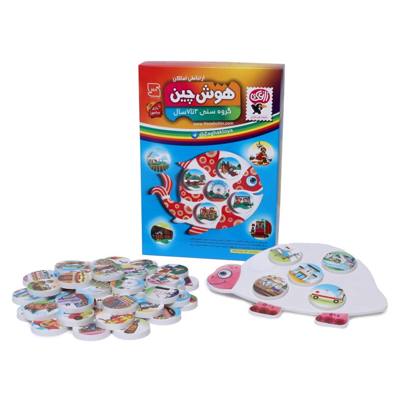 شناخت محیط پیرامون از ضروریات مسلم برای کودکان به شمار می‌رود. با بزرگتر شدن بچه‌ها لازم است که آن‌ها را با مکان‌های مختلف خارج از خانه آشنا کرد. هوش چین ارتباطی اماکن با چنین هدفی طراحی و تولید شده است. در این بازی هر پنج تشتک تصاویر مرتبط به یک مکان مثل فرودگاه، باشگاه ورزشی، شهربازی، مزرعه، مدرسه، رستوران و غیره را نشان می‌دهند. مربی یا بزرگترِ کودک یکی از تشتک‌ها را وسط پایه‌ای به شکل ماهی یا لاک‌پشت که دارای پنج حفره است قرار می‌دهد و کودک باید چهار تشتک مرتبط با آن را پیدا کند و در جاهای خالی بگذارد. می‌توان به هنگام گذاشتن تشتک‌ها در مورد آن مکان خاص با کودک صحبت کرد و تا جایی که حوصله و سن کودک اجازه می‌دهد به او اطلاعات داد. نتیجه‌ی ایده‌آل زمانی حاصل می‌شود که بعد از بازی با هوش چین بتوانیم کودک را به محل ببریم و از نزدیک با مکان‌های مورد نظر آشنا کنیم.