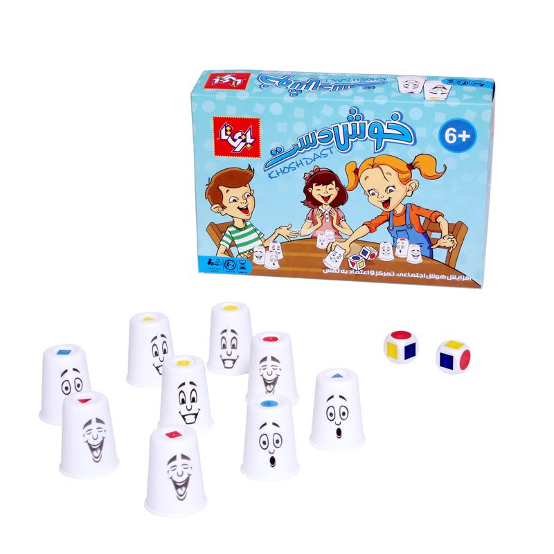 خوش دست یک بازی ساده و پر هیجان است که یکی از مهمترین مهارت‌های لازم برای زندگی و بخصوص علم ریاضی یعنی تفکر منطقی و قدرت استدلال را به شیوه‌ای جذاب به کودکان آموزش می‌دهد. در این بازی تعدادی لیوان داریم که ته آن‌ها یکی از سه شکل مربع، مثلث یا دایره به یکی از سه رنگ قرمز، آبی و زرد چاپ شده است. دو تاس هم داریم که روی هر وجه آن‌ها یکی از شکل‌ها به یکی از رنگ‌ها قرار دارد. هر دو تاس با هم ریخته می‌شود و بازیکنان باید بر اساس تاس‌هایی که آمده است، زودتر از بقیه لیوان درست را انتخاب کنند و بردارند. اگر هر دو تاس یک شکل با همان رنگ را نشان بدهند، باید همان لیوان را برداشت؛ اما اگر تاس‌ها متفاوت باشند باید لیوانی را برداشت که شکل یا رنگ یا هر دو در تاس‌ها موجود نباشد.
