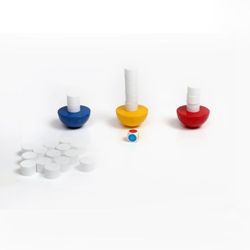 توانایی چیدن یکی از اولین مهارتهایی است که کودکان میآموزند. آنها تمایل دارند که این مهارت را بارها و بارها امتحان کنند. بازی تعادل از همین مهارت ساده درقالب یک بازی جذاب سود برده است. یک روش بازی چنین است که سه نیمکره را روی سطحی صاف میگذاریم. بازیکنان به نوبت تاس میاندازند و یکی از مهرهها را روی نیمکرهای که رنگش را تاس نشان میدهد، میگذارند. این روند ادامه پیدا میکند تا زمانی که تعادل یکی از نیمکرهها به هم بخورد و مهرهها بریزند. هماهنگی چشم و دست و افزایش دقت و تمرکز از مهمترین اهدافی است که این بازی دنبال میکند.