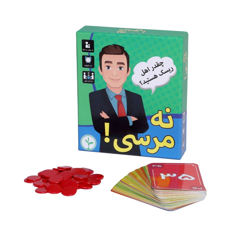 با وجود قوانین بسیار ساده، نه مرسی یک بازی گروهی بسیار جذاب است که میتواند شما را به شدت درگیر بازی کند! در این بازی هر بار یک کارت رو میشود که روی آن عددی از ۳ تا ۳۵ نوشته شده است. بازیکنی که نوبتش است یا آن را برمیدارد یا با پرداخت یک ژتون نوبت را به نفر بعدی میدهد. شمارههای روی کارت امتیاز منفی هستند اما اگر بتوانید اعداد را ردیف کنید، تنها پایینترین رقم امتیاز منفی آن ردیف حساب میشود. این بازی قدرت ریسک را بالا میبرد.