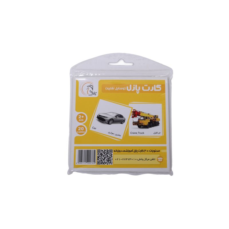 کودکان از سنین بسیار پایین کشش خاصی به وسایل نقلیه نشان می‌دهند. در کارت پازل آموزشی وسایل نقلیه ۲۰ مورد متفاوت بر روی کارت‌هایی به ابعاد حدوداً ۱۱×۱۱سانتیمتر با تصویرهای واقعی و جذاب معرفی شده است. نام وسایل نقلیه به دو زبان فارسی و انگلیسی نوشته شده است، بنابراین می‌توان از این کارت‌ها با هدف آموزش زبان نیز استفاده کرد. از ویژگی‌های کارت پازل‌های آموزشی این است که بعد از استفاده به منظور شناخت جهان پیرامون، می‌توان از روی خطوط نقطه‌چینی که در پشت کارت‌ها وجود دارد آن‌ها را قیچی کرد و پازل‌های دو یا چهار قطعه درست کرد و به این ترتیب بر قدرت حل مسئله‌ی کودکان نیز افزود.