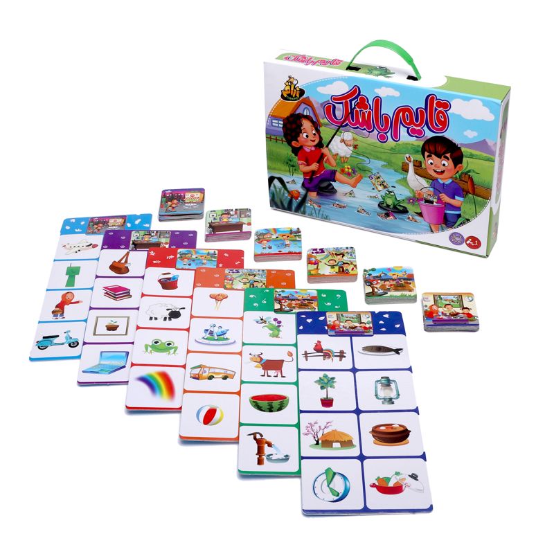 قایم باشک در واقع شبیهسازی بازی معروفی است که در آن یک نفر از اتاق بیرون میرود و بقیه چیزی را برمیدارند یا جابجا میکنند تا موقع برگشتن متوجه شود چه چیزی عوض شده است. در این بازی نیز ۶ کارت بزرگ وجود دارد که در بالای آن تصویری از محیطی نشان داده شده است. کودک باید به دقت تصویر را نگاه کند و کارتهای کوچک را متناظر با چیزی که از تصویر بالا حذف شده است در کنار جای درست بگذارد. سپس کارتهای کوچک را به صورت برعکس روی جای خود میگذارد. اگر درست چیده باشد تصویری کامل از ۸ قطعه کارت به وجود میآید. این بازی به تقویت حافظه و بالا رفتن دقت کودک کمک میکند. بعلاوه میتوان از پشت کارتهای بزرگ به صورت جورچین یا با هدف رنگآمیزی هم استفاده کرد.