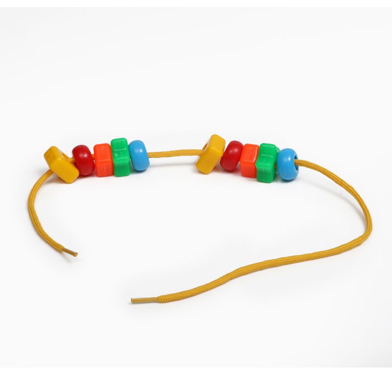 این وسیله شامل 50 مهرهی پلاستیکی در رنگهای درخشان و شکلهای متنوع و 5 بند بافتهی رنگی است. صِرف نخ کردن مهرهها فعالیتی جذاب و در عین حال مفید برای کودکان به شمار میرود. این فعالیت ضمن تقویت ماهیچههای ظریف دست کودک به هماهنگی هر چه بیشتر بین چشم، مغز و دست کودک که در آینده برای عمل سادهای مثل نوشتن یا انجام یک عمل جراحی پیچیده بسیار ضروری است، کمک میکند. در عین حال با کمک این وسیله کودکان رنگها و شکلها را یاد میگیرند و میتوانند الگوسازی را که یکی از پایههای درک مفاهیم ریاضی است، انجام دهند. کیفیت خوب و تنوع چشمگیر مهرهها از نظر شکل و رنگ از ویژگیهای بارز این محصول است.