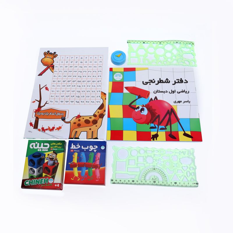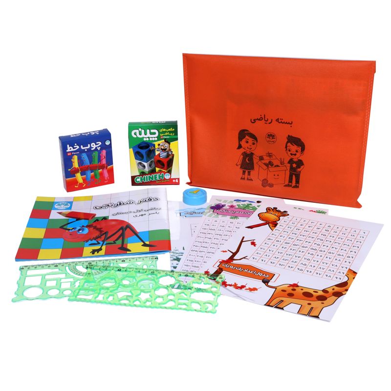 در این بسته تقریباً تمام وسایلی که دانشآموزان کلاس اول ابتدایی برای درس ریاضی خود به آنها احتیاج دارند، گنجانده شده است تا والدین بتوانند به راحتی و یکجا آنها را تهیه کنند. وسایل شامل یک جعبه چینه ۲۰ تایی، یک جعبه چوب خط ۶۰ تایی، یک جلد دفتر شطرنجی، یک ساعت مُهردار، ۳ برگ جدول اعداد، و دو شابلون هندسی ژلهای است که در یک کیسهی پارچهای بستهبندی شدهاند.