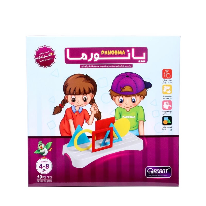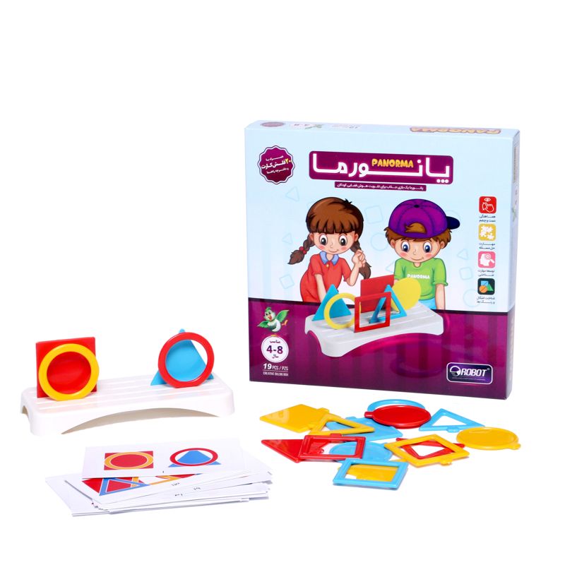 پانورما یک بازی جذاب با هدف تقویت هوش فضایی-دیداری کودکان است. در این بازی کودکان باید با دیدن کارتهای الگو در بارهی چیدمان و ترتیب قرار گرفتن شکلها تصمیم بگیرند و شکلهای مربع، مثلث و دایرهی تو خالی و تو پُر را روی پایهای که دارای ۴ ردیف و ۴ ستون حفره است، طوری جایگذاری کنند که نمای روبرو شکل روی کارت را نشان بدهد. بهترین روش این است که بگذاریم کودکان خود با آزمون و خطا به جواب درست برسند و این بهترین راه برای تقویت قدرت حل مسئله است. کارتهای الگو از ساده به پیچیده شمارهگذاری شدهاند و توصیه میشود که کودکان کارتها را به ترتیب شمارهها انجام دهند. از این طریق اعتماد به نفس کودکان هم تقویت میشود.