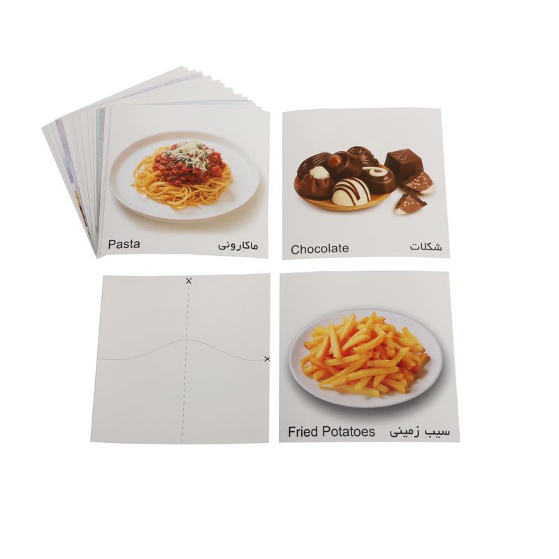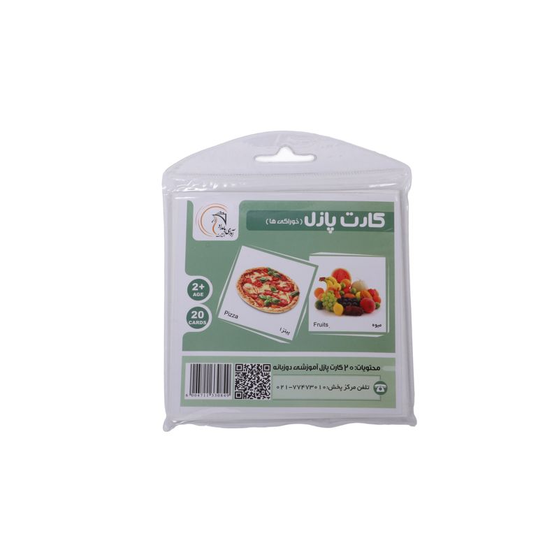 خوراکیها از جمله موضوعات مورد علاقهی کودکان هستند و به همین دلیل میتوان از آنها برای اهداف آموزشی استفاده کرد و مطمئن بود که توجه کودکان به خوبی جلب میشود. در کارت پازل آموزشی خوراکیها برخی از خوردنیهای معمولاً مورد توجه کودکان به دو زبان فارسی و انگلیسی معرفی شدهاند. از این کارتها میتوان برای بازیهای مختلف از جمله زبانآموزی استفاده کرد. در عین حال وجود خطوط نقطهچین در پشت کارتها این امکان را فراهم میکند که آنها را به دو یا چهار تکه قیچی کرد و از آنها پازل ساخت. حل پازل به افزایش قدرت حل مسئله کمک میکند.