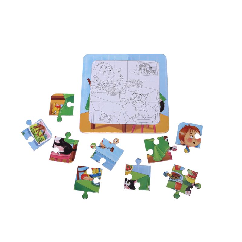 پازلها یا جورچینها از آن دسته وسایل سرگرمی هستند که علاوه بر فواید زیادی که برای آنها برمیشمارند، طیف وسیعی از گروههای سنی را هم در بر میگیرند. نکتهی مهم در انتخاب پازل برای فرد تعداد قطعات و اندازهی قطعات آن است. هر یک از پازلهای پسر و پیشی دارای ۹ قطعه است و برای کودکانی مناسب است که قبلاً پازلهای دو قطعهای، چهار قطعهای و یا شش قطعهای را به راحتی انجام داده باشند. هر پازل نشانگر یکی از فعالیتهای روزمرهای است که کودکان انجام میدهند، مثل غذا خوردن، بازی کردن، حمام کردن و غیره. هنگام درست کردن پازل میتوان در مورد هر فعالیت با کودکان گفتگو و مواردی که باید رعایت شود را گوشزد کرد.