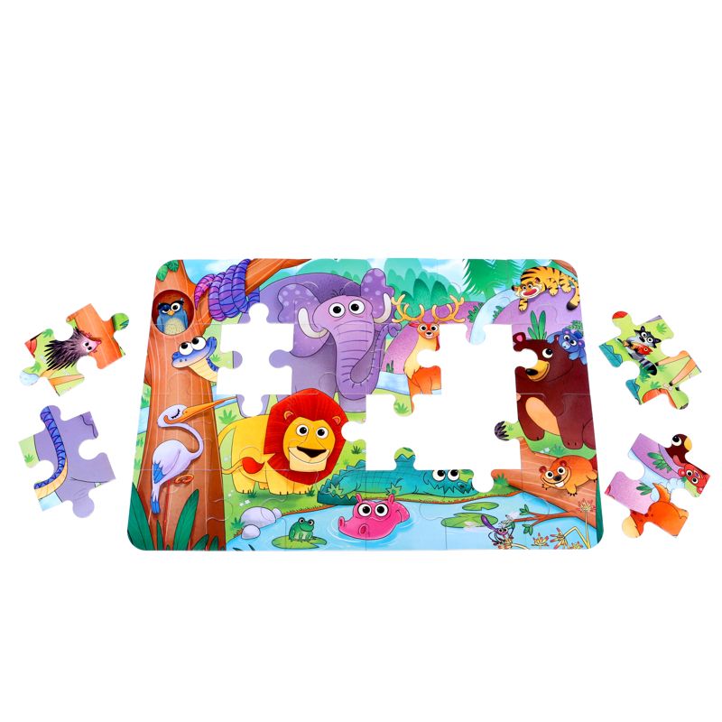 پازلها از جمله بازیهایی هستند که علاوه بر سرگرم کردن کودکان مهارتهای بسیاری را در آنان تقویت میکنند و از جمله آنها را با جهانی که در آن زندگی میکنند، آشنا میسازند. پازل بزرگ در جنگل چه خبر یک پازل با ۲۴ قطعه بزرگ است که در نهایت یک تابلوی ۷۰×۵۰ سانتیمتری از حیوانات مختلف و متنوع جنگل میسازد. کیفیت بالای قطعات و همچنین طراحی و رنگآمیزی بسیار زیبای این پازل از مزیتهای آن به شمار میرود.
