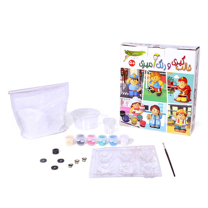 عمل ساختن یا خلق چیزی، هر چه که باشد، در بالا بردن اعتماد به نفس سازنده نقش مؤثری دارد. مجموعهی قالبگیری و رنگآمیزی مشاغل نه تنها چنین فرصتی را ایجاد میکند بلکه امکان آشنایی کودکان با مشاغل مختلف را هم فراهم میسازد. این مجموعه شامل پودر مجسمهسازی، دو پیمانه، یک کاسه برای درست کردن خمیر، قالب برای ۶ آدمک نماینده مشاغل گوناگون، شش رنگ اصلی گواش، یک قلم مو، شش قطعه آهنربای حلقهای و دفترچهی راهنماست. کودکان میتوانند از ۵ سالگی، تحت نظارت بزرگترها، خمیر مجسمهسازی را آماده و قالبگیری و پس از اضافه کردن آهنربا، در نهایت آنها را با توجه به شغل هر آدمک رنگآمیزی کنند. از ماکتهای آماده شده میتوان برای بازیهای تخیلی و نقشآفرینی یا تزئین روی هر سطح فلزی استفاده کرد. از دیگر فواید این مجموعه میتوان به افزایش صبوری و پرورش خلاقیت اشاره کرد.
